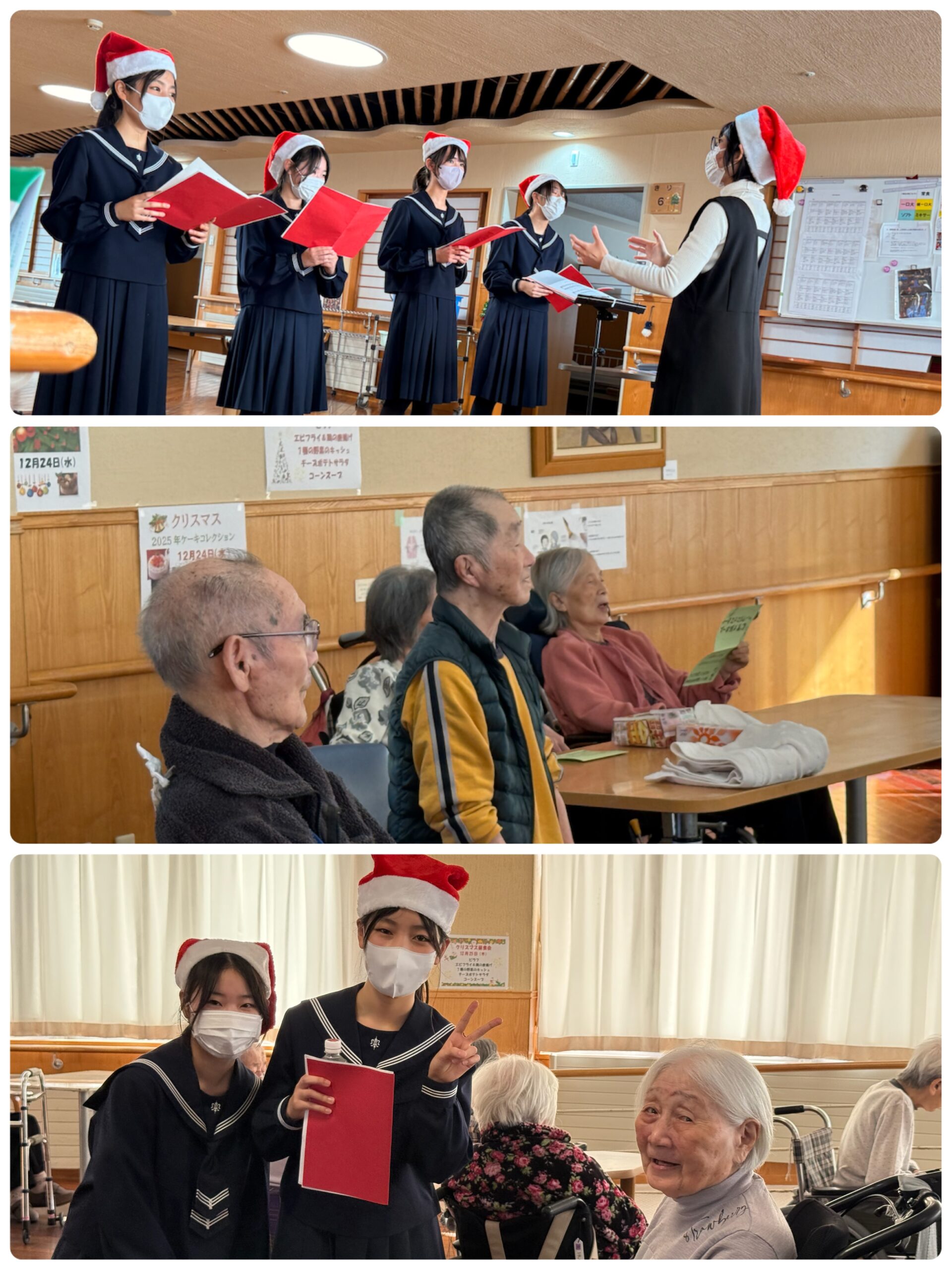 令和7年12月23日 七里ガ浜ホームに美しい歌声が響き渡った日となりました。 湘南白百合学園コーラス部の学生さん達が素晴らしい歌を聴かせに来てくださいました。 「花」滝廉太郎、「赤とんぼ」山田耕作、「ああベトレヘムよ」「もろびとこぞりて」 「サンタが街にやってくる」等。。ご利用者の中には一緒に歌う方、手でリズムやタクトを振る方、 ハミングする方、涙ぐむ方もいらっしゃいました。 2Fではアンコールに「しずけき」まで 歌っていただいたり! 一日早いクリスマスプレゼントのようなひと時でした。